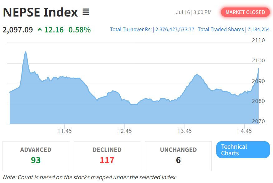 आइतबार सेयर बजारमापक नेप्से परिसूचक १२.१६ अङ्कले उकालो लागेर २०९७.०९ को बिन्दुमा पुगेर रोकिएको छ । सेन्सेटिभ इन्डेक्स पनि २.९० अङ्कले उकालो लागेर ३९४.१५ को बिन्दुमा पुगेर रोकिएको छ । समग्रमा वर्षकै अन्तिम दिनको नेप्से ०.५८ प्रतिशतले उकालो लागेको छ भने सेन्सेटिभ इन्डेक्स ०.७४ प्रतिशतले उकालो लागेको छ ।